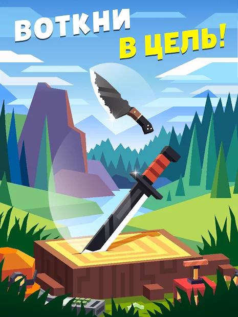 Flippy Knife - Аркадная игра с красочной, пиксельной графикой и приятной музыкой. Игроку нужно сделать точный бросок оружием и поразить мишень. Бросайте ножи, оттачивайте мастерство, выполняйте трюки, попадите в движущуюся мишень. Перемещайтесь по красивым локациям, выполняйте задания и получайте за это награды. Расширяйте свой арсенал и соберите всю коллекцию холодного оружия.