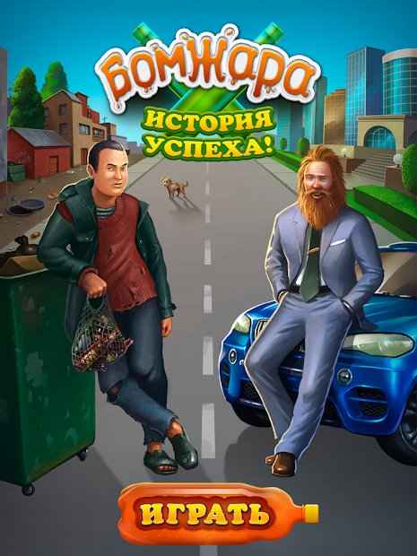 Бомжара - история успеха! - Оригинальное название уже само по себе привлекает внимание. В игре «под свое крыло» вам придется взять бомжа. Без вашей помощи этот изгой общества будет опускаться все ниже и ниже. Помогайте ему развиваться и сохранять достигнутые результаты, подталкивайте к рискованным шагам и серьезным решениям. Ведите его к успеху и признанию, преодолевая всевозможные препятствия и осваивая новые горизонты!