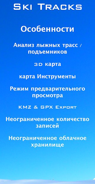 Ski Tracks поможет всем любителям лыжного спорта вести учет тренировок, проводить их анализ, оценивать свои достижения на разных трассах и склонах, сравнивать их с результатами других спортсменов. В приложении можно не только анализировать результаты катания, но и размещать фотографии. Ski Tracks потребляет мало энергии, работает в фоновом режиме и не мешает звонить и принимать звонки.
