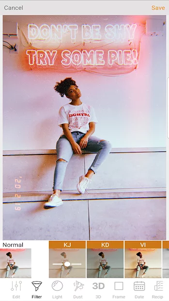 Kuji Cam is suitable for amateurs of photo editing. Using the application, you can create vintage photos. The program contains many beautiful filters. Add frames, film dust, frames, date stamps to your photos. The application can use a 3D effect, timer. An instant view function is available.