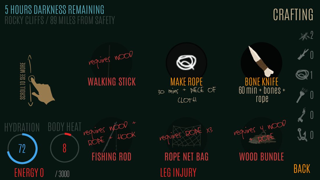 Survive - Wilderness survival (modificación para abrir recursos): en este juego debes convertirte en un sobreviviente que fue capturado por la naturaleza. Para sobrevivir, tendrás que encontrar recursos básicos como agua, comida, leña que te ayudarán a ganar fuerza y llegar a tu destino. En la trama del juego hay tareas interesantes para las cuales el jugador podrá obtener bonos o herramientas útiles. La jugabilidad es adictiva porque el juego no es en absoluto una plantilla.