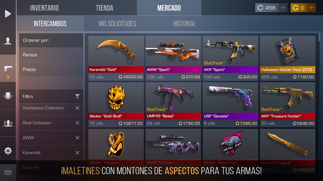 Para obtener una nueva apariencia para un arma en particular, podemos abrir cofres de forma gratuita, pero, por supuesto, también hay cofres pagos, donde las cosas aparecen en un rango superior. Podemos comprar esos cofres por oro. Si estás cansado de las máscaras de tu inventario, puedes venderlas en el mercado poniéndolas a la venta. También busca algo nuevo para ti.