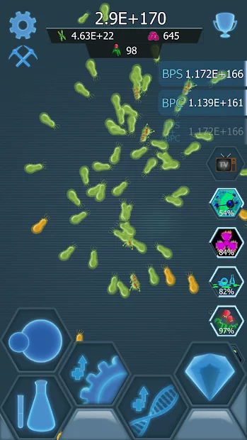 Bacterial Takeover - ce clicker fascinant ne laissera personne s'ennuyer. Vous serez en mesure de créer des types de bactéries sans précédent, qui, avec une augmentation de leur niveau, seront modifiés et s'adapteront à l'environnement, développant une immunité aux médicaments développés. Le jeu est compliqué par le fait que vous devez conquérir le monde entier et créer des colonies avant que vos bactéries ne soient détruites par le vaccin.