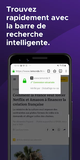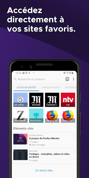 Ce navigateur est conçu pour que toute recherche soit accompagnée d'émotions agréables. Il n'a pas de gel et regorge d'une grande variété de fonctions utiles. Vous pouvez également consulter l'historique des sites visités, enregistrer les mots de passe ou annuler l'enregistrement automatique de l'historique et des mots de passe dans les paramètres. Pour une recherche pratique de vos sites préférés, vous aurez la possibilité de les ajouter à vos favoris.