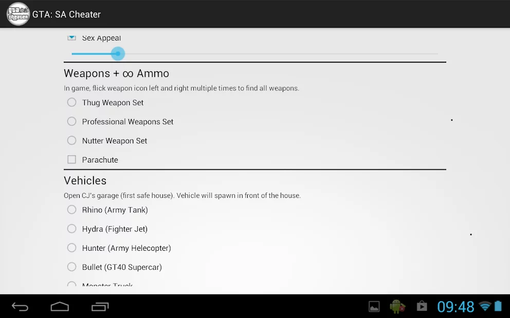- Accès Complet aux Codes de Triche : L'une des caractéristiques peu connues est la possibilité d'activer tous les codes de triche directement via l'application. Cela inclut non seulement les triches standards pour les armes et la santé, mais aussi des triches plus exotiques comme la modification de la météo ou le contrôle des véhicules.