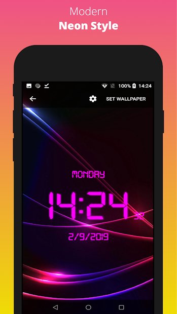 Avec une telle montre numérique, votre téléphone aura un look complètement différent. Cela le rendra plus coloré, attrayant et inhabituel. Avec le nouveau design, le smartphone aura l'air particulièrement personnel. Il existe également une fonction pour personnaliser le fond d'écran en direct, ce qui transformera votre écran et le rendra lumineux. Choisissez une palette de couleurs qui convient à votre humeur. Une telle application vous aidera toujours à connaître l'heure et la date exactes.