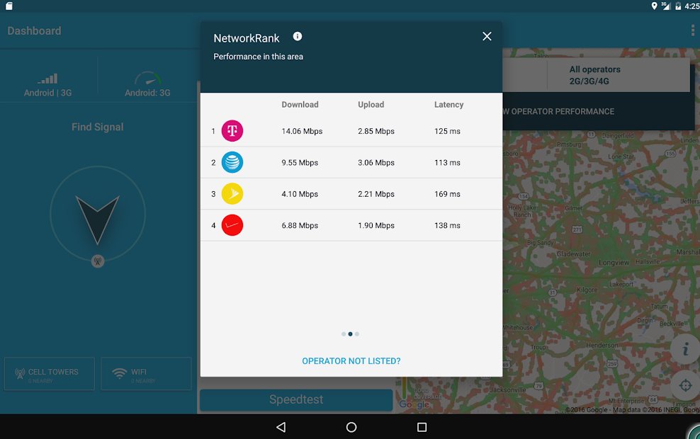 L'application Test de vitesse 3G & 4G Opensignal vous aidera à trouver rapidement un signal réseau fort à proximité et à ne pas perdre de temps à communiquer avec des interruptions de dialogue. L'utilisateur a accès à une représentation graphique sur la carte, où le WiFi le plus stable, toutes les antennes et les routeurs WiFi sont disponibles à proximité. L'application dispose d'une boussole intégrée, avec son aide, vous pouvez tester la vitesse de transmission des informations. Si nécessaire, l'utilitaire enregistre les données reçues dans la mémoire du smartphone ou sur une carte SD.